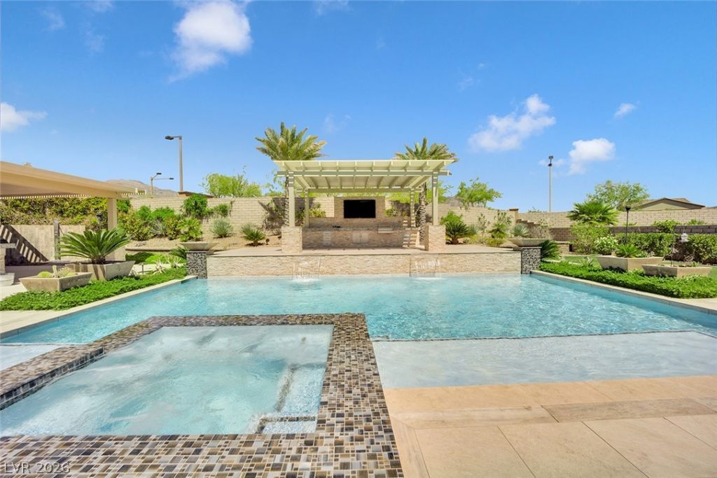 Absolutely stunning single-story gated community home w/gated entry courtyard. This home is one of the largest lots in Paseos Village at Los Altos of Summerlin West. The home features 4 spacious bedrooms w/ensuites, separate living & dining room w/double sided fireplace. Huge open kitchen for the chief in you with a separate prep area & huge dream come true butlers pantry, huge island, all overlooking living room. Primary bedroom features a huge dream shower, soaking tub, double sinks, walk in closet w/built ins. Other bedrooms separate from primary, one w/choice of separate entrance & all bedrooms w/ensuites & walk in closets. Home features office/library area. This beautiful home is on amazing oversized 1/2 acre lot, oversized pool w/water falls & fire columns, spa w/entertainment deck, outside pool shower entertainment area, built in bbq & kitchen area, golf area w/beautiful mountain views. PLUS garage built in's w/epoxy floor & ROLADEN SHUTTERS THROUGH OUT. You will love this home!